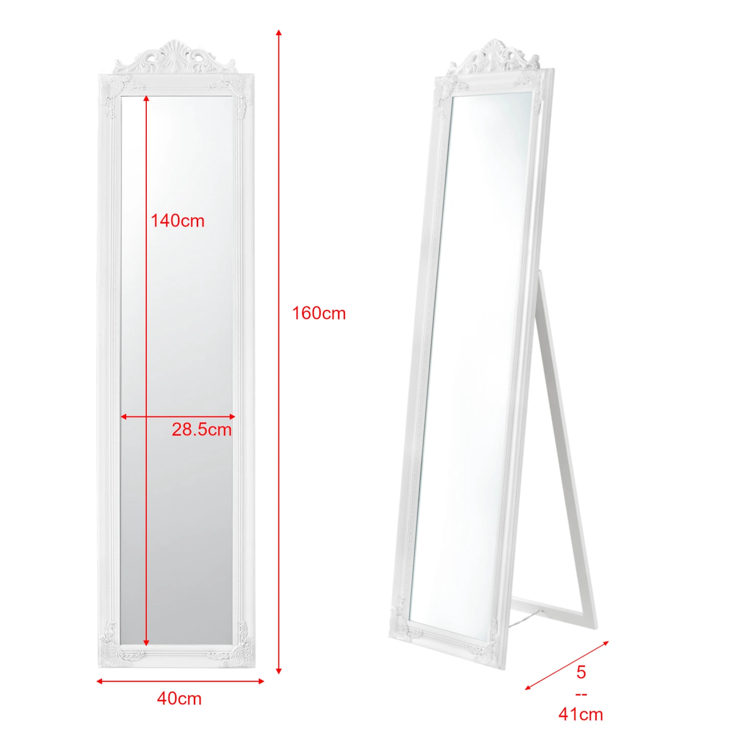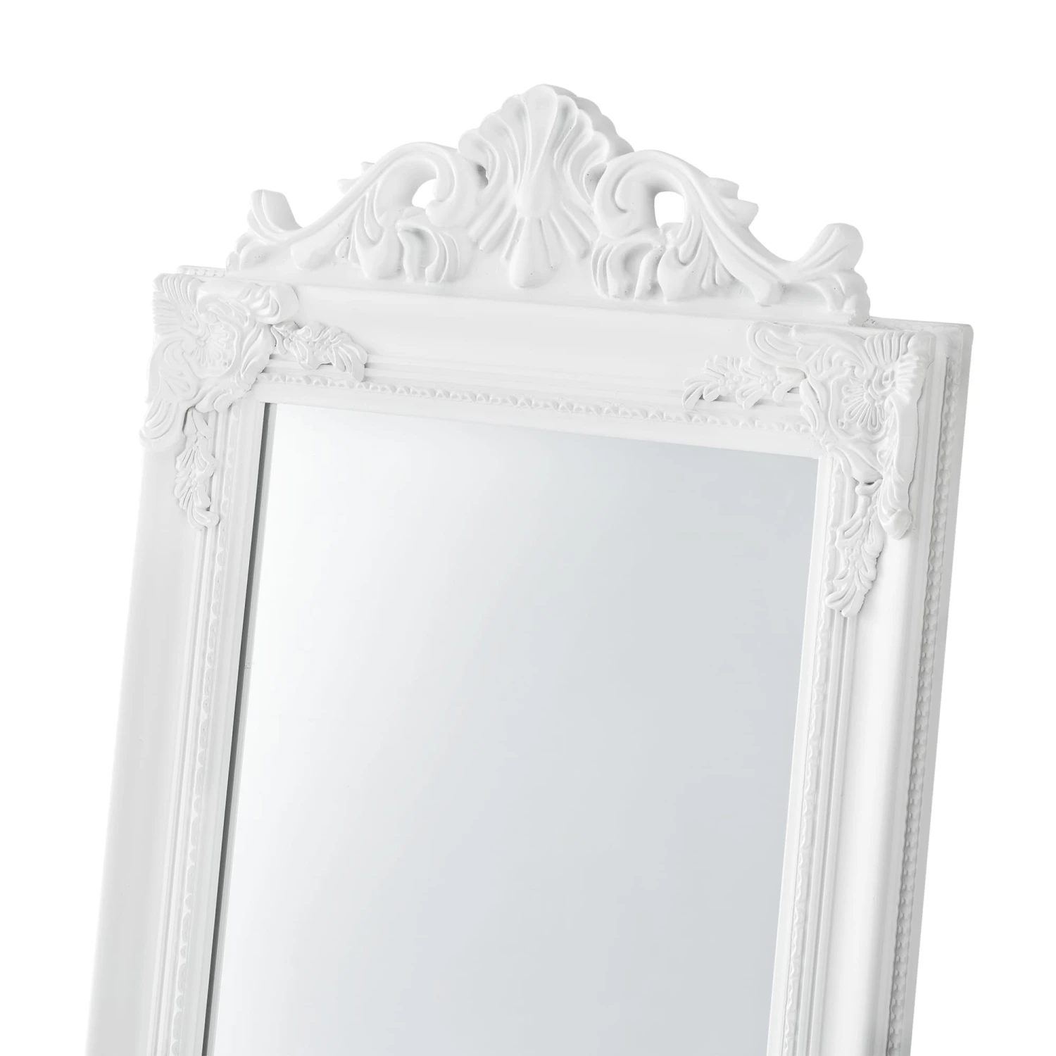 Der Ganzkörperspiegel eignet sich ideal für Ihren Flur, Ihr Schlafzimmer, Ihren Ankleideraum oder wo auch immer Sie einen Spiegel benötigen. Durch den verzierten Rahmen im dekorativen Barock-Stil sorgt er stets für eine klassische und elegante Atmosphäre. Der neigbare Aufsteller sorgt für einen stabilen Stand.